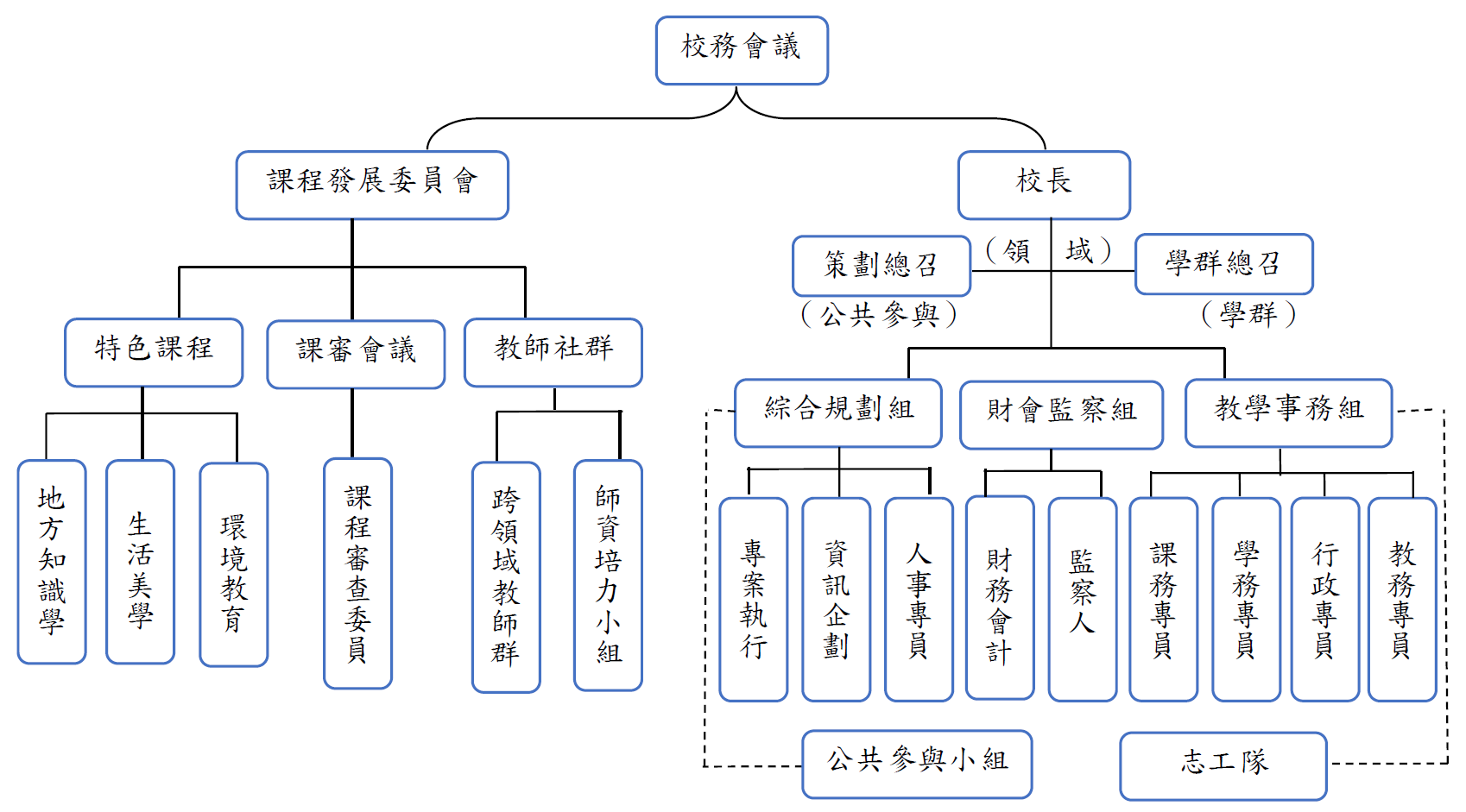 本校以「校務組」、「課務組」、「學務組」與「總務組」做為業務編組,每一組成 員 2-3 人,係針對課程規劃、教案設計、學員(社團)經營,進行系統化、專業化之落實;人事編制上,則依學校經營之需求進行工作人員之招募,並使其適才適所,藉由其專長與辦學理念相結合,進而達到社大工作者是一夥伴關係的群體。