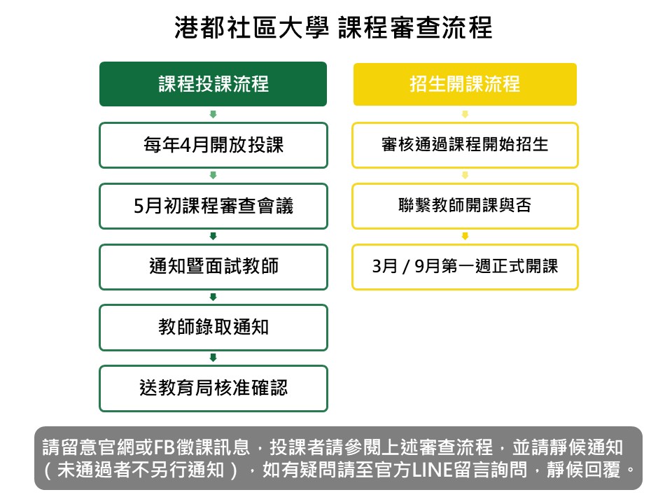 港都社區大學邁入第三年了,感謝大眾的支持和協助!為了讓課程求新求變、教學日新月異,我們需要教師們齊心協力,認同港都社大辦學理念,實踐社大公共性、落實公民參與,期待您的加入,是港都社大茁壯成長的基石。